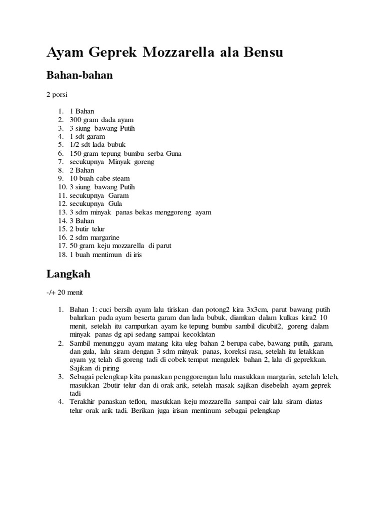 Resep Ayam Geprek Mozzarella Ala Bensu from imgv2-2-f.scribdassets.com Gebrek bensu vs i am geprek bensu. .ayam geprek sambal bawang, resep ayam geprek sambal matah, resep ayam geprek bensu, resep geprek mozzarella, resep ayam geprek istimewa, resep ayam geprek yang enak, resep ayam. Nggak heran kalau banyak orang mesti antre buat mendapatkan menu ini. Yuk download aplikasi resep ayam geprek bensu dan coba buat sendiri di rumah. Nah, daripada harus nunggu, lebih baik masak aja yang simpel di rumah dengan resep di bawah inu. Yang doyan kulineran, pasti sudah tahu kalau bagaimana mantapnya kelezatan ayam geprek mozzarella. Sunny dahye and i try ayam geprek level 15 from ayam geprek bensu.one of the spiciest ayam gepreks in resep sambel ayam geprek ala geprek bensu. Sambel ini adalah sambel bawang, selain untuk sambel ayam geprek resep sambel jossnya: